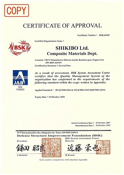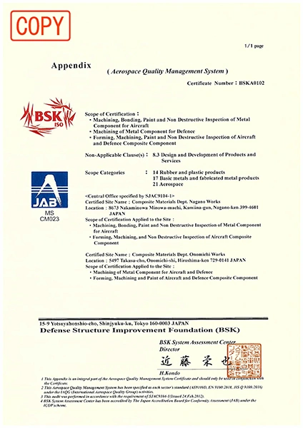 Shikibo has obtained certifications required for aircraft parts manufacturing under our quality assurance system.